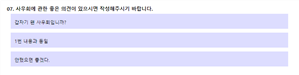 마지막 “사우회에 관한 좋은 의견이 있으시면 작성해주시기 바랍니다.”라는 주관식 질문에 다양한 답변이 나왔습니다. “갑자기 왠 사우회입니까?”라는 질문을 던지신 분도 계셨고 “1번 내용과 동일”이라는 의견을 남겨주셨는데 익명이라 어떤 답을 하셨는지 알 수 없는게 아쉽네요. “안했으면 좋겠다.”라는 명확한 의견을 남겨주신 분도 계셨습니다.