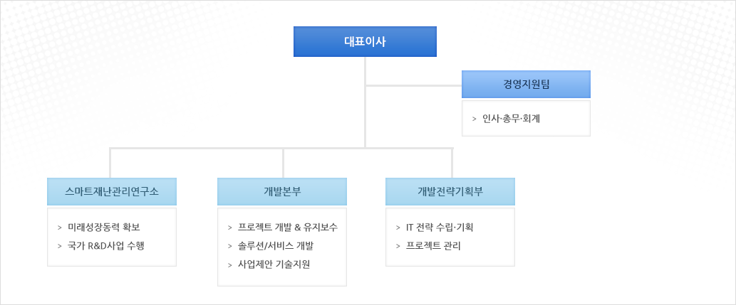 스마트재난관리(Smart Disaster Management)란 실시간 재난예측, 감지, 대응이 가능하도록 정보통신기술(ICT), 항공우주기술(ST), 로봇기술, 나노기술(NT), 바이오기술(BT) 등 첨단기술을 융합하여 시스템적으로 관리하는 것을 말하며, 전 세계적으로도 전략적 고도화를 추진하고 있습니다. 이러한 추세에 맞추어 본 연구소에서도 스마트 재난관리 연구개발 사업 확충과 미래 성장동력 확보를 위해 노력하고 있습니다. 조직은 플랫폼을 기획, 개발하는 플랫폼기획부와 플랫폼 융복합 개발지원 및 솔루션 기능개선을 수행하는 플랫폼개발팀, 국가 R&D 사업수행과 신규 플랫폼개발을 담당하는 C&D팀으로 구성되어 있습니다.