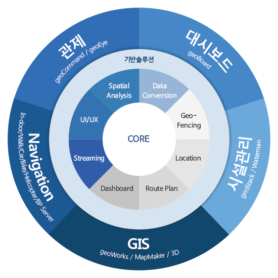 JBT의 핵심 솔루션인 JBMap Suite은 공간정보에 기반한 토탈 업무 솔루션으로 크게 기반솔루션과 응용솔루션으로 구성됩니다. 기반솔루션은 Location, Spatial Analysis, geo Fencing 과 같은 LBS 및 관제업무 기반의 되는 강력한 원천기술로 이루어진 단위 기술 모듈로써, 플랫폼과 운영환경에 비종속적으로 개발된 솔루션입니다. 이러한 기반 솔루션을 이용하여 각각의 업무 분야에 최적화된 응용솔루션을 제공하고 있습니다. 관제, 대시보드, 시설관리, GIS, Navigation의 응용솔루션은 각 업무의 특성에 따라 단독, 또는 조합된 형태로 공급되고 있으며 실제 적용된 사례는 [Business] 메뉴를 통해 확인해 보실 수 있습니다.